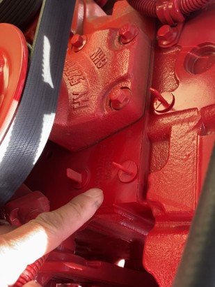 2、東風(fēng)多利卡D9灑水車,配康明斯230馬力發(fā)動(dòng)機(jī),發(fā)動(dòng)機(jī)缸體號,在發(fā)動(dòng)機(jī)的前方,主駕駛座椅下面的位置,找到皮帶輪,靠近身體一側(cè)的皮帶輪旁邊有兩個(gè)塑料,像以前老式電視機(jī)調(diào)頻道的開關(guān)一樣的配件,這兩個(gè)配件,上下在一條直線上,這兩個(gè)配件中間就是缸體號。