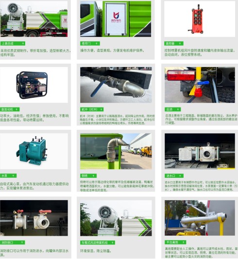 我公司生產的抑塵車同時還配置灑水泵,可實現綠化噴灑功能,更能在緊急情況下,實現低壓消防灑水功能。同時噴霧機也可以作為農藥噴灑裝置使用,實現多種功能集于一身,一車多用,噴霧車上裝載有高性能遠程噴霧機,射程遠、覆蓋范圍廣、工作效率高、除塵速度快。所有灑水系統閥門可加裝氣動控制,氣控開關集成在駕駛室內操作。節約了人工成本,降低了作業人員勞動強度。