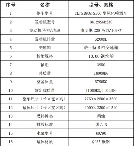 1、整車(chē)型號(hào):  CLT5180GPSEQ6型綠化噴灑車(chē)